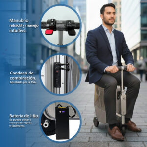 La Hyper-Suitcase-E combina tecnología, resistencia y comodidad. Su motor de cubo está diseñado para ofrecer una velocidad constante con un consumo energético reducido, lo que disminuye la fricción y prolonga su vida útil. La batería de litio extraíble es segura para viajes en avión y se desmonta con facilidad, permitiendo empacar sin complicaciones.