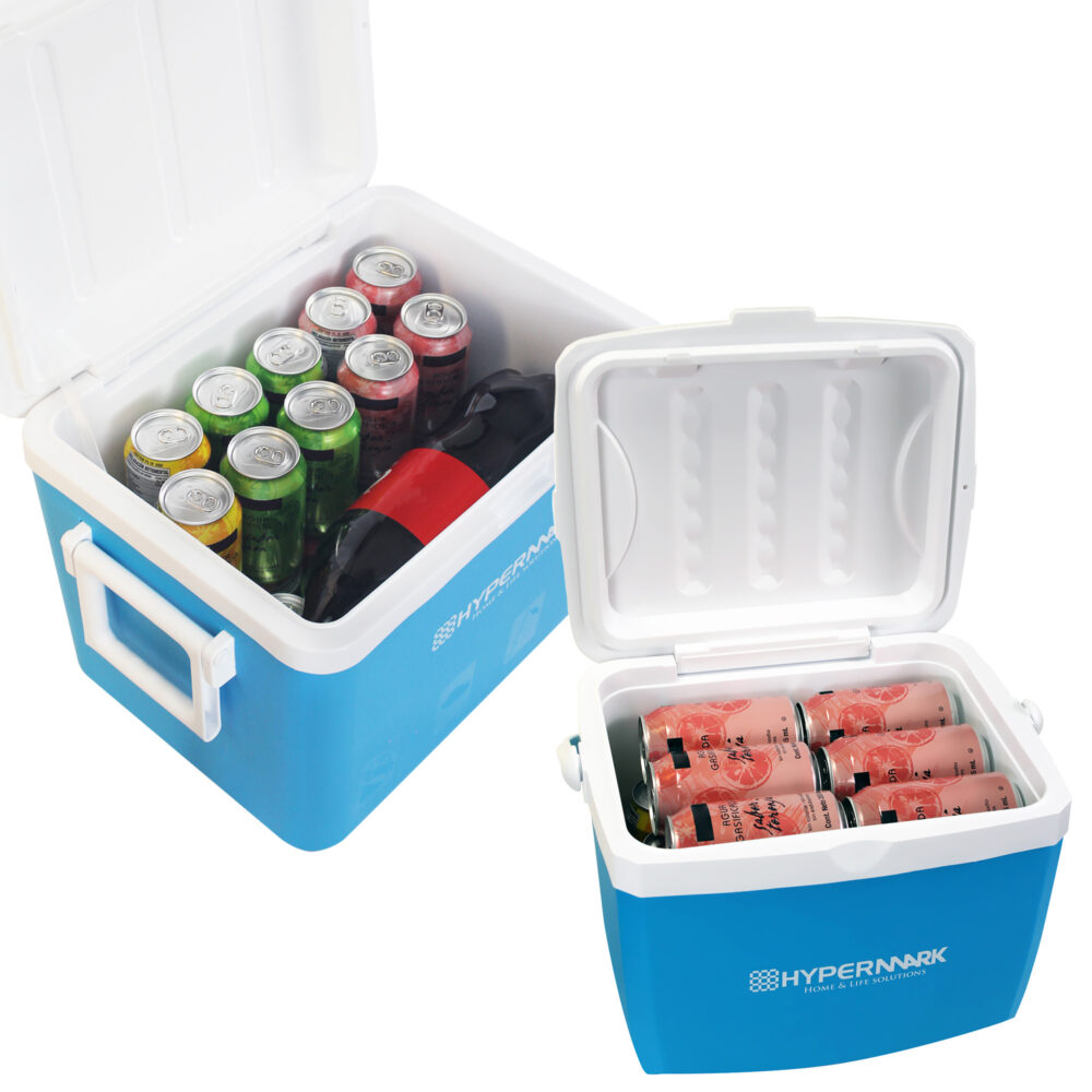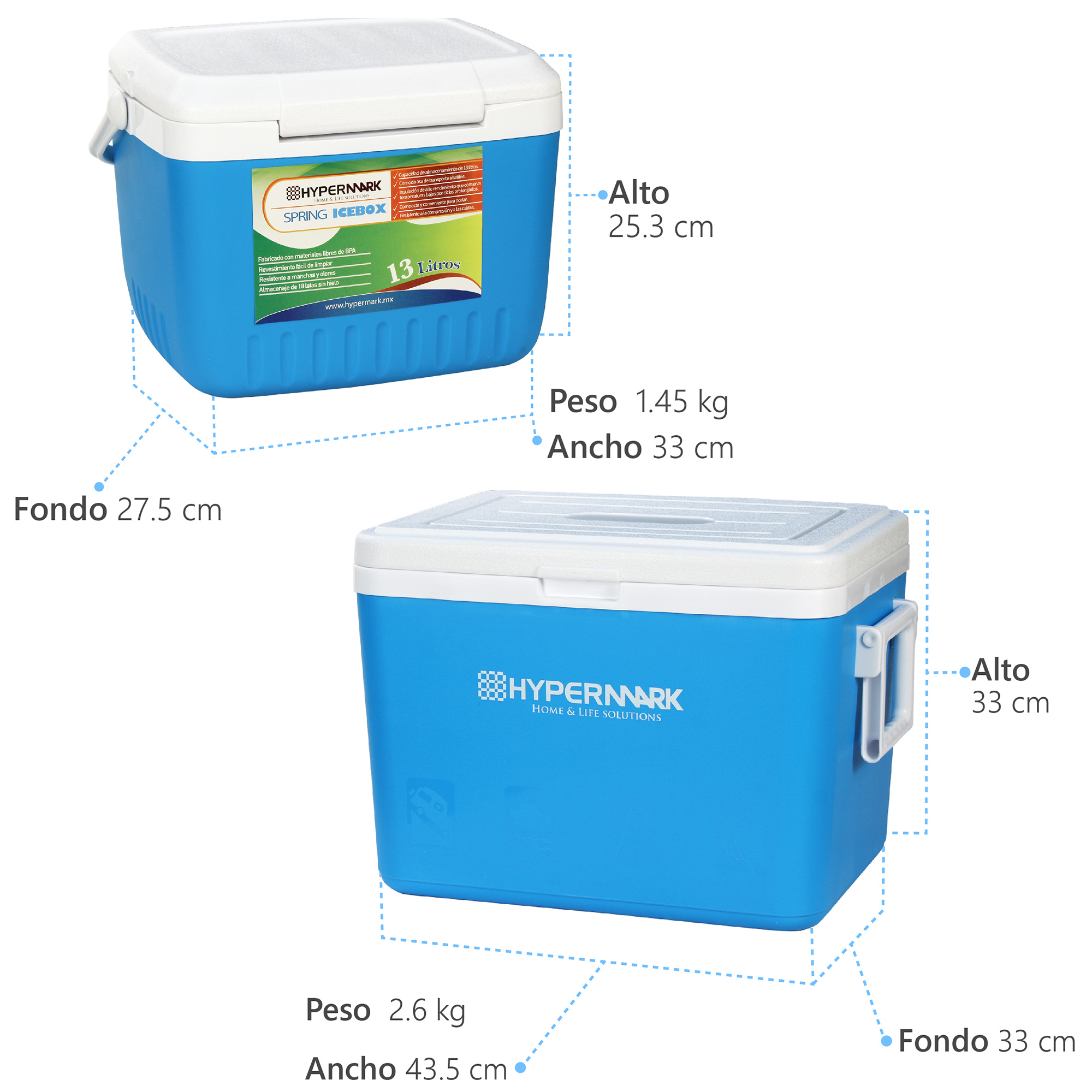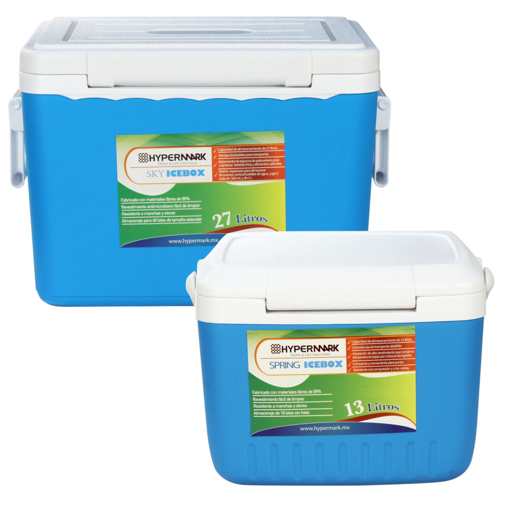 La hieleras Hypermark con capacidad de 27 litros y 13 litros son ideales para llevar en viajes en carretera, fiestas, reuniones, salidas de pesca o excursiones a la montaña. Su diseño portátil facilita su transporte y se ajusta perfectamente en la cajuela de tu coche, te permite transportar de forma segura tus bebidas y alimentos ya que poseen asas reforzadas, puede almacenar hasta 40 latas la hielera mediana y hasta 18 latas de 330 ml la hielera mediana, ambos modelos garantizan una temperatura constante y garantizan que tus bebidas se mantengan frías y alimentos frescos en cualquier lugar, ambas hieleras tienen tapas con ajuste de presión.