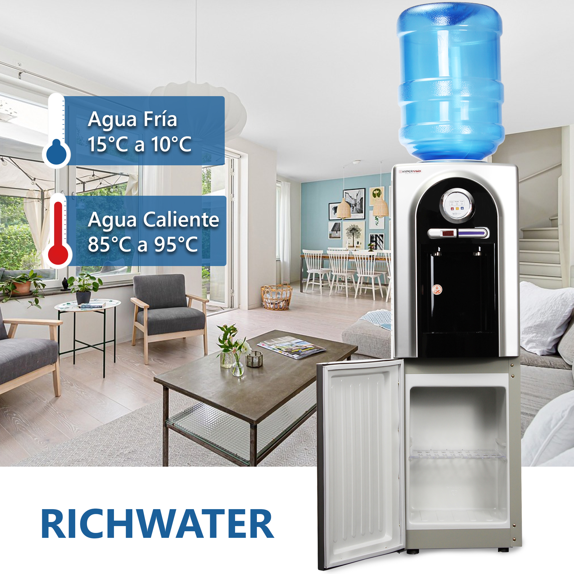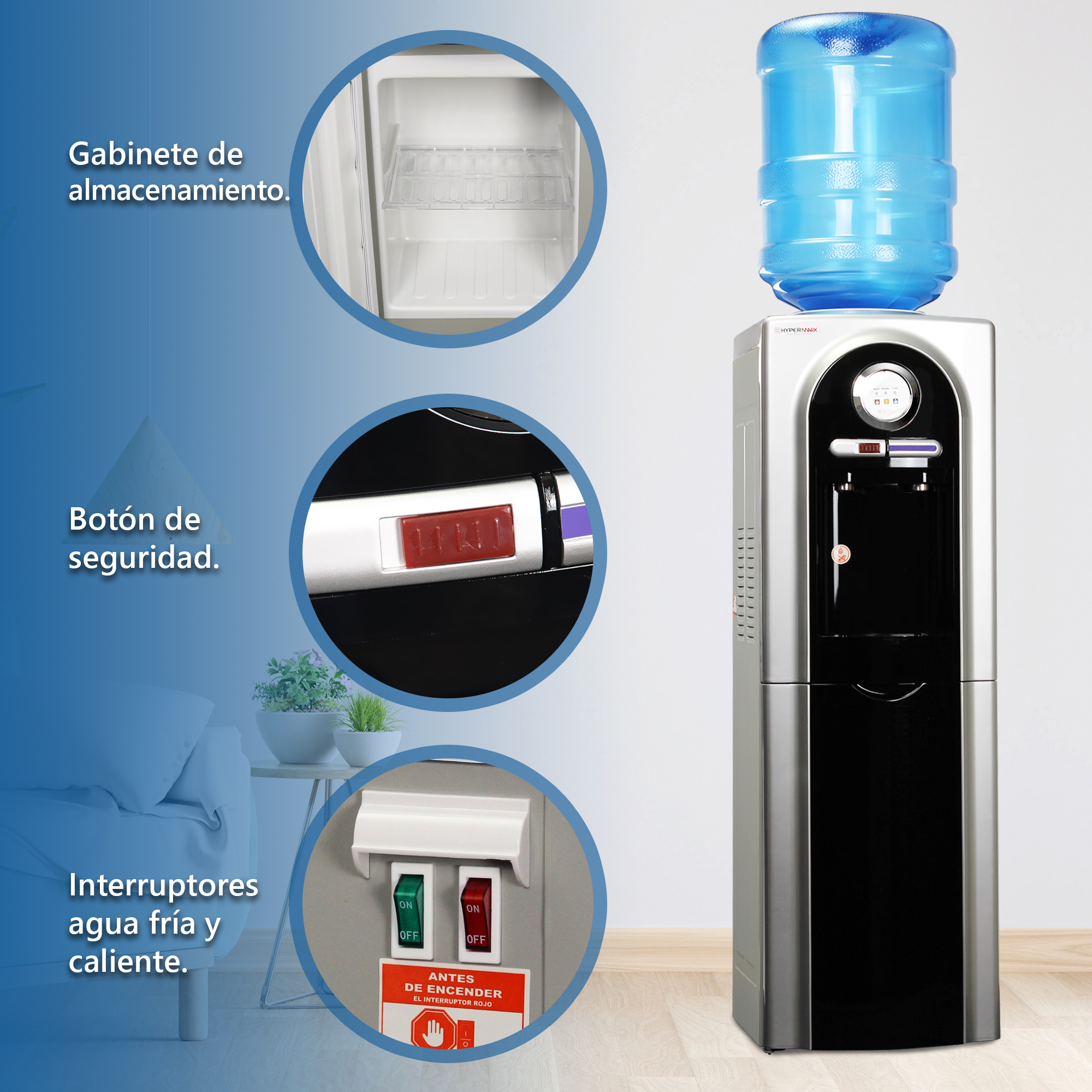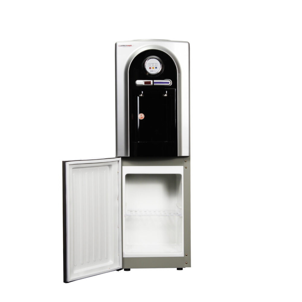 Diseño innovador y moderno, puedes colocarlo en tu cocina, oficina o estancia dando un toque de elegancia; prepara tus bebidas calientes con una temperatura máxima de 95°C en menos de 2 minutos de forma rápida y simple, evita de tener accidentes su botón con bloqueo de seguridad anti-quemaduras, su funcionamiento termoeléctrico de bajo consumo eléctrico proporciona un desempeño de agua fría hasta 10°C brinda una sensación térmica de agua fresca justo para esos días calurosos. Practico gabinete de almacenamiento para guardar una despensa pequeña.